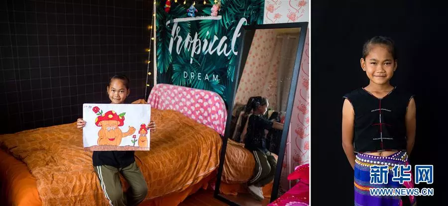 右图:叶多,佤族,今年11岁,勐卡镇小学四年级学生(6月15日新华社记者秦晴摄);左图:叶多在位于勐卡镇班哲村二组的家中卧室展示自己的绘画作品(6月15日新华社记者胡超摄)。画画是她的兴趣爱好。