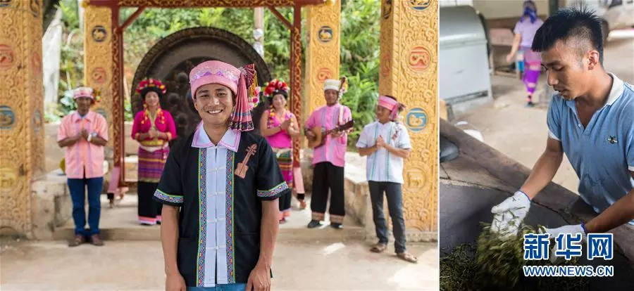 左图:勐海县布朗山布朗族乡老曼峨村村民岩烟叫(布朗族)。在他身后,村民在展示布朗弹唱(6月13日新华社记者胡超摄);右图:岩烟叫在炒制刚刚采下的茶叶。他毕业于云南林业职业技术学院园林工程专业,回乡创业做茶叶初制加工,家里种植茶叶约80亩,2018年收入约20万元(6月13日新华社记者秦晴摄)。