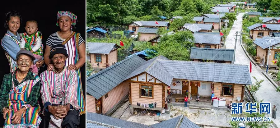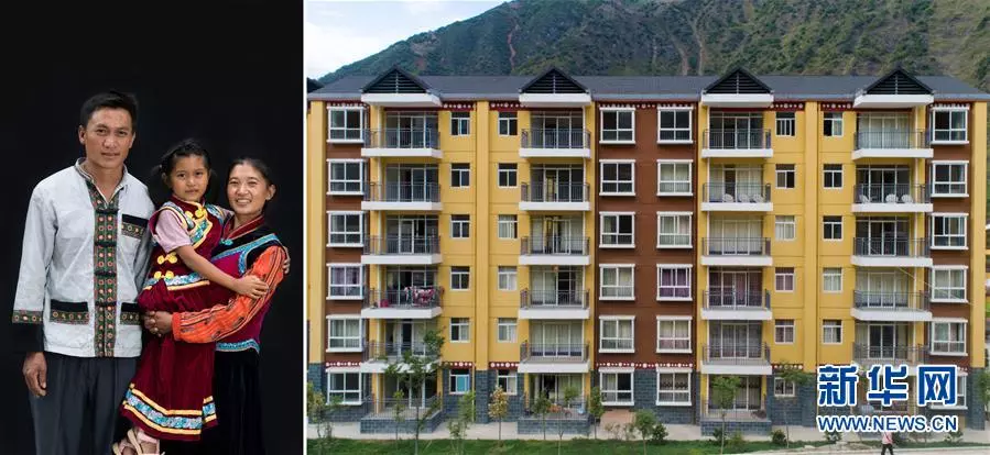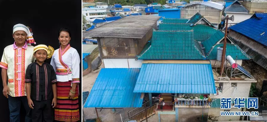 左图:怒江傈僳族自治州泸水市大兴地镇维拉坝“珠海社区”傈僳族村民杨玉兴(左)一家合影(6月24日新华社记者秦晴摄);右图:大兴地镇维拉坝“珠海社区”一角。杨玉兴一家2018年12月从大兴地镇维拉罗三组搬入该社区。他家种植核桃树4000株,草果20亩,全家年收入约4万元(6月24日新华社记者胡超摄)。