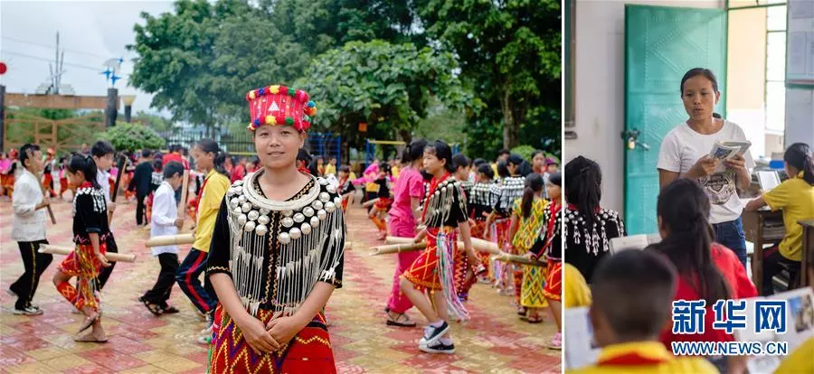 左图:芒市西山乡营盘民族小学老师雷木宽(景颇族)。在她身后,学生们在开展民族舞“目瑙纵歌”课间操(6月21日新华社记者胡超摄);右图:雷木宽在课堂上(6月21日新华社记者秦晴摄)。