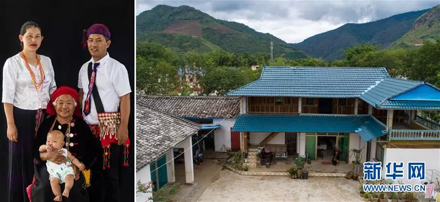 左图:西双版纳傣族自治州景洪市基诺山基诺族乡洛特村洛特老寨基诺族村民阿二(后排右)一家合影(6月11日新华社记者胡超摄);右图:阿二家2017年修建的新房。他家种植了50亩茶叶和约4000株橡胶,年收入约16万元(6月11日新华社记者秦晴摄)。