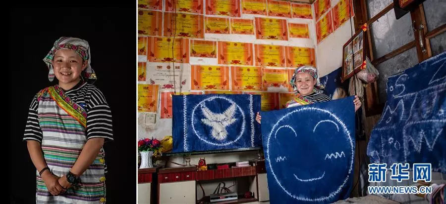 左图:李晓娜,独龙族,今年12岁,家住贡山县独龙江乡献九当村,在独龙江中心学校上五年级(6月21日摄);右图:李晓娜在家中展示自己的扎染作品(6月21日摄)。 新华社记者 江文耀 摄
