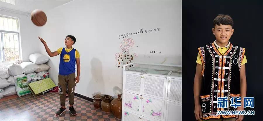 右图:扎朵,拉祜族,今年14岁,家住勐梭镇班母村十四组,勐梭镇民族中学初一学生(6月16日新华社记者胡超摄);左图:扎朵在房间展示他心爱的篮球(6月16日新华社记者秦晴摄)。他从小喜欢打篮球,偶像是篮球运动员詹姆斯·哈登。