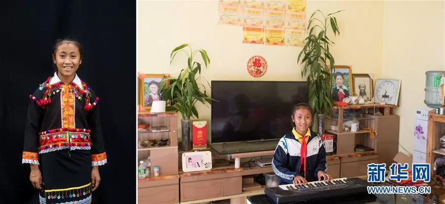 左图:李成香,德昂族,今年12岁,家住芒市三台山德昂族乡出冬瓜村,三台山德昂族乡九年制学校五年级学生(6月19日新华社记者秦晴摄);右图:李成香在家里弹电子琴(6月19日新华社记者胡超摄)。她的梦想是成为钢琴家。