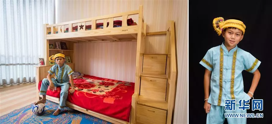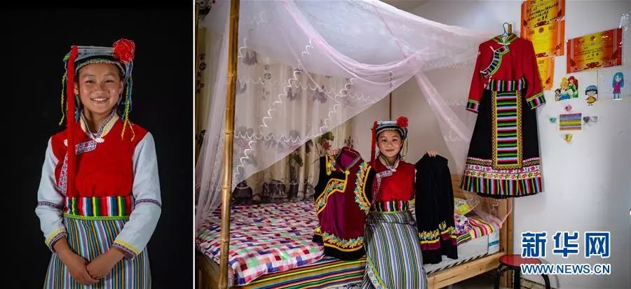 左图:丰元吉,怒族,今年12岁,家住贡山县丙中洛镇甲申村(6月22日摄);右图:丰元吉在卧室里展示自己收集的民族服饰(6月22日摄)。她很喜欢少数民族服装,常常会穿其他民族的服装去表演。 新华社记者江文耀摄