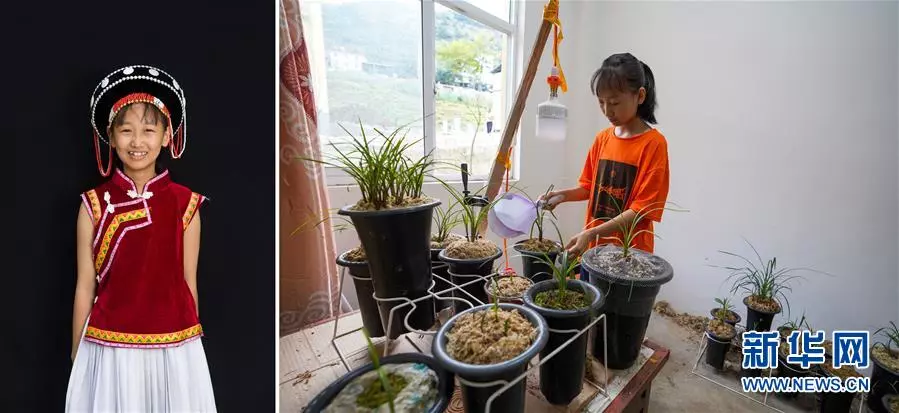 左图:杨旭海,傈僳族,今年13岁,泸水市大兴地镇维拉坝“珠海社区”六年级学生(6月24日新华社记者秦晴摄);右图:杨旭海在新家给兰花浇水(6月24日新华社记者胡超摄)。她希望长大后学习园林园艺。