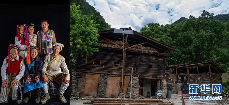 左图:怒江傈僳族自治州贡山县独龙江乡迪政当村独龙族的“文面女”李文仕(前排左)一家合影(6月21日摄);右图:李文仕和其他村民的房子(6月21日摄),这些房子是当地政府在2011年统一修建的。新华社记者 江文耀 摄