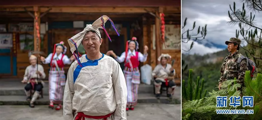 左图:贡山县丙中洛镇双拉村村民陈丽军(怒族)。在他身后,双拉村文艺队队员在展示怒族的吹拉弹唱(6月22日摄);右图:陈丽军在巡护森林途中(6月23日摄)。 新华社记者 江文耀 摄