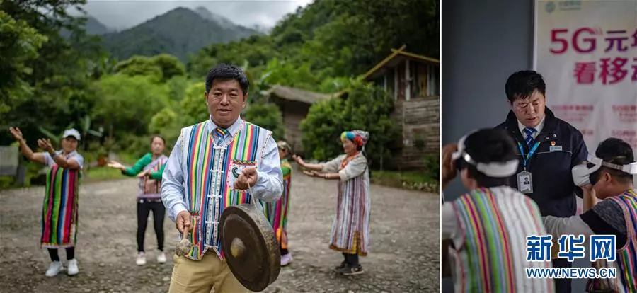 左图:在贡山县独龙江乡移动营业厅上班的马春海(独龙族)。在他身后,独龙族群众在跳本民族舞蹈(6月21日摄);右图:马春海在指导当地群众体验5G虚拟现实。独龙江乡今年开通了5G试验基站(6月21日摄)。 新华社记者 江文耀 摄