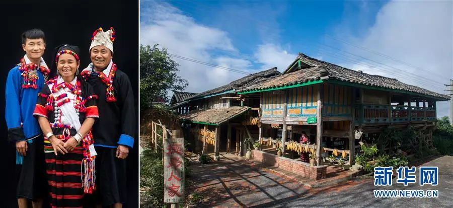 左图:德宏傣族景颇族自治州芒市三台山德昂族乡出冬瓜村三组德昂族村民李腊六(右)一家合影(6月19日新华社记者胡超摄);右图:李腊六家的房子入选了古村落保护项目,于2017年进行翻修,保持了原始的建筑风貌,现在经营特色民宿,去年收入约6万元(6月19日新华社记者秦晴摄)。