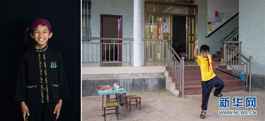 左图:石宝,景颇族,今年12岁,家住芒市西山乡弄丙村跌撒小组,在西山乡营盘民族小学读六年级(6月20日新华社记者胡超摄);右图:石宝在家中的院子展示刀舞(6月20日新华社记者秦晴摄)。他从小就喜欢本民族的舞蹈,刀舞尤其跳得好。