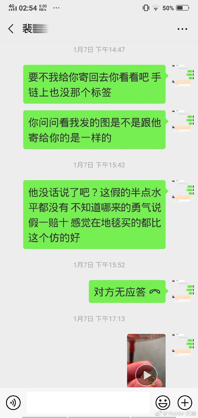 “我拆开快递后,发现(手链)是塑料的,于是和裴某沟通。但她让我去鉴定,说卖的绝对是正品。”郭某某还晒出了手链的特写图片及视频,他认为和正品相去甚远。据郭某某讲述,他想与裴某协商,但对方一直不接电话,拒绝沟通,并拉黑了他的手机号。无奈之下,他开始借身边朋友手机打她电话,可是她也拒绝沟通。