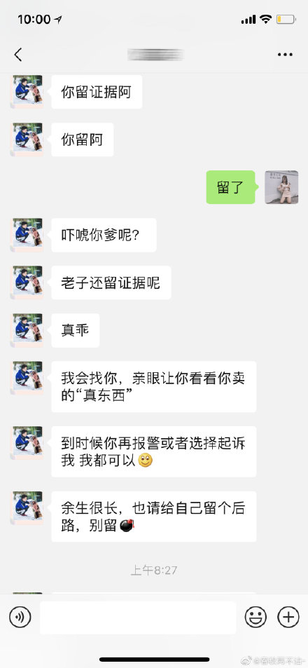 这段视频迅速在网上发酵,转发数量超过22万次。“遭遇骚扰威胁”、“警察未能立案”等情节引起无数网友关切,很多人转发扩山或者@警方希望能引起关注。不过也有一些网友指出,当事人所提供的证据太少。在评论区中记者看到“春秋两不沾-”贴出了一张聊天记录截图,其中对方说“我会找你,亲眼让你看看你卖的‘真东西’”,“余生很长,也请给自己留个后路”。