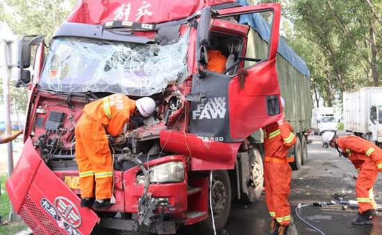 消防员到达现场后,发现为一辆满载饲料的高栏货车追尾一辆水泥罐车,两车将同方向车道完全堵死,而尾车的大货车车头受撞击已经严重变形,前面挡风玻璃破裂,车门受撞击无法打开。导致车内司机右腿无法动弹。