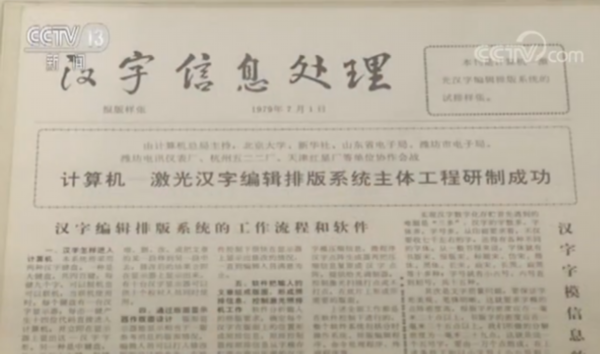 1979年7月,新中国诞生第一张用“计算机-激光汉字编辑排版系统”整张输出的中文报纸。此后,从成功排出样书《伍豪之剑》,到在新华社中实用成功,汉字激光照相排版系统成为新中国第一个计算机中文信息处理系统,后来不仅风靡全国,也出口到日本和欧美等发达国家。