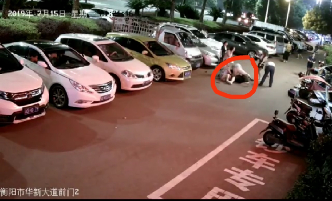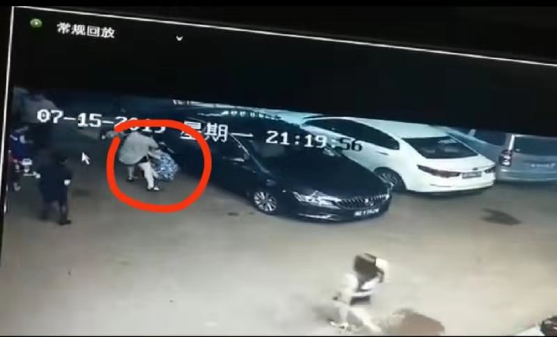 龚琳雅(红圈中身着花衣服者)被踹倒在地。监控视频截图