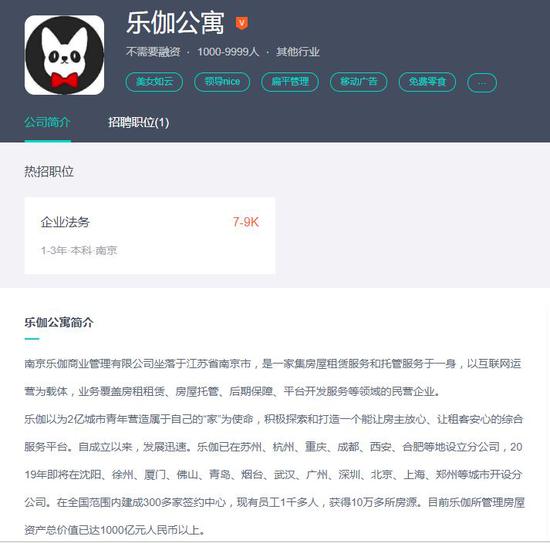 按照乐伽公寓在招聘平台上的介绍,其计划2019年在沈阳、徐州、厦门、佛山、青岛、烟台、武汉、广州、深圳、北京、上海、郑州等城市开设分公司。在全国范围内建成300多家签约中心,现有员工1千多人,获得10万多所房源。目前乐伽所管理房屋资产总价值已达1000亿元人民币以上。