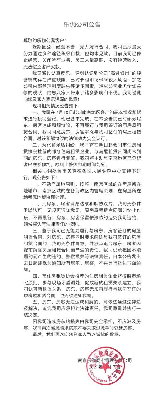 8月7日晚间,乐伽公寓通过其微信公众号发布公告称,确认公司已停止经营,关闭所有业务,员工大量离职,没有经营收入,无法偿还客户欠款。