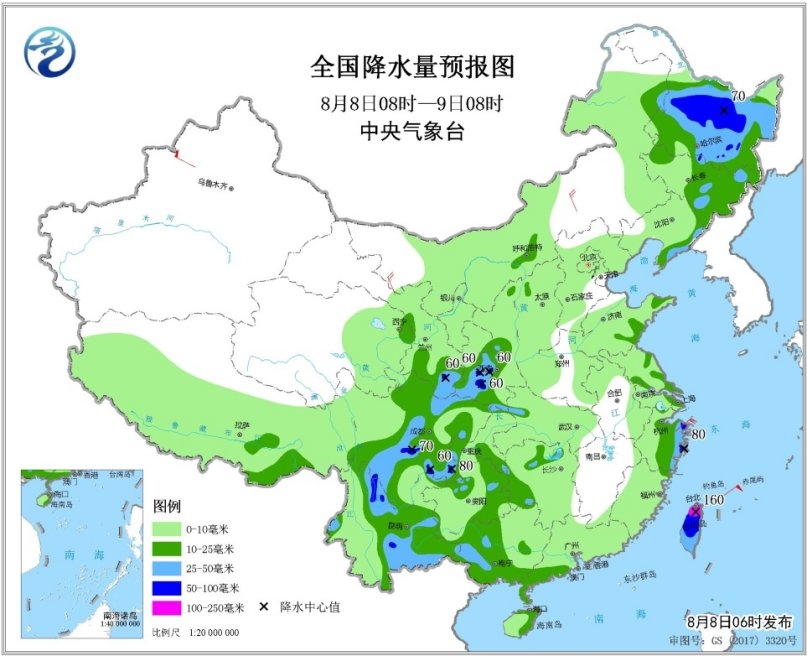 今天东北等地仍有较强降雨,另外随着台风“利奇马”靠近,台湾也将开始出现强降水。中央气象台预计,8日08时至9日08时,黑龙江中南部、甘肃南部、陕西南部、西南地区北部和东部、云南北部和东部、广西西部、浙江东部、台湾岛等地的部分地区有大雨或暴雨,其中台湾岛北部局地有大暴雨。