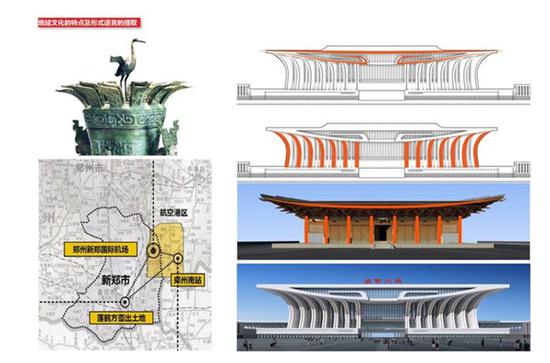 同济大学建筑设计研究院(集团)有限公司完成的郑州南站设计方案,该公司项目负责人张少森介绍,郑州南站总体布局取意天圆地方,东西广场共同构成巨幅圆形构图,方正的站房嵌于其中,外形像一个大大的“莲鹤方壶”。“郑州南站通过中国传统建筑与‘莲鹤方壶’地域文化的形式提取,正立面借鉴莲鹤方壶和青铜尊构型,创造出与新郑机场‘龙跃中原’交相辉映的‘鹤舞九州’的建筑新形象,充分展现了高铁时代的民族复兴,彰显了当代中国文化的高度自信。”