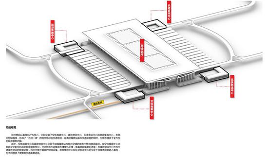 “郑州南站采用以高铁站房为核心,构建集空铁换乘中心、高铁物流中心、汽车客运中心和旅游集散中心‘五位于一体’现代综合交通枢纽,”郑州市城乡规划局相关负责人表示,按照规划,在满足高铁站基本交通功能的同时,将为旅客提供全方位的延伸服务。