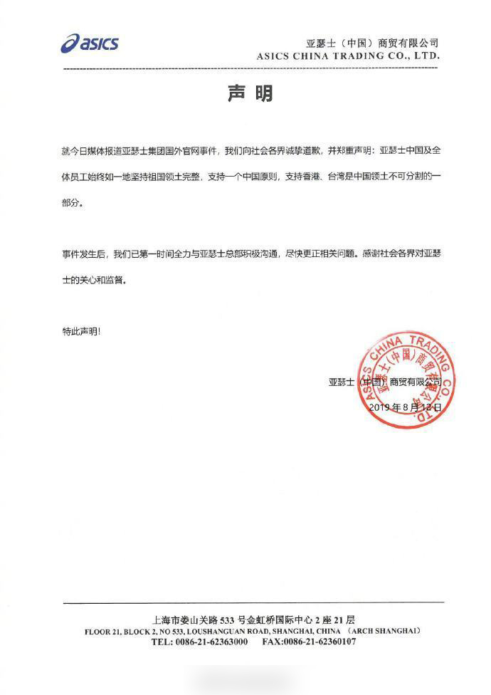 搜狐娱乐讯 8月12日,日本运动品牌亚瑟士被曝辱华,爆料者发现亚瑟士的官方将香港澳门台湾单独列为国家,事件爆发后,亚瑟士官方公开道歉,随后代言人宋威龙,韩东君方也宣布结束于亚瑟士的合作。