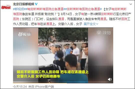 针对“女子驾劳斯莱斯堵医院应急通道”一事,@北京妇产医院 8月14日发布通报称,今天上午9点15分左右,一位女士开车到医院看病,没有走社会车辆入口进行排队,而走的是医院急救专用通道,且不听从车场工作人员劝阻,将车停在急救专用通道。工作人员报警后,交警和民警先后赶到现场,交警对该女士进行现场处罚。10点21分,该女士开车离开急救专用通道。