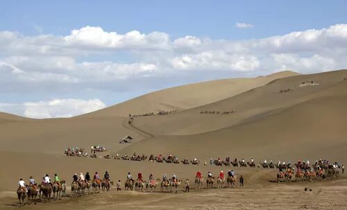 游客在甘肃省敦煌市鸣沙山月牙泉景区游览。新华社发(张晓亮 摄)