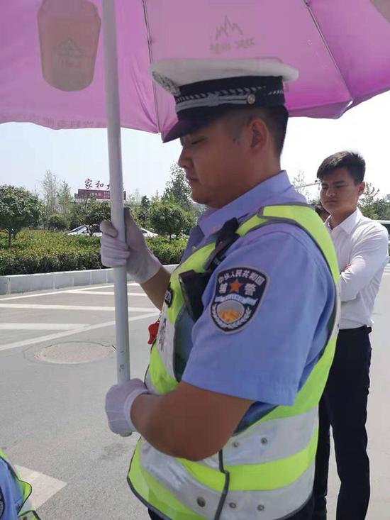 由于正值交通午高峰期间,为防止交通拥堵,付晟毅与几位同事分工合作,维护事故现场并及时疏导周围车辆。此时,付晟毅看到老人坐在地上无法行动,身旁又没有树荫遮挡,在阳光的暴晒下脸上露出痛苦的神色。付晟毅立即跑到警亭取了一把大遮阳伞,站在老人身边为其撑伞遮住强烈的阳光。