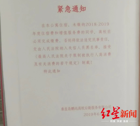 芝芝告诉红星新闻,在每一栋鹏远公寓楼下,都张贴了红色字体的告示,根据芝芝提供的图片,红星新闻看到上面写道,对于未缴纳费用的学生,将“依法追究民事责任,交由人民法院纳入失信人员黑名单,接受《最高人民法院关于限制被执行人高消费及有关消费的若干规定》制裁。”告示落款为“秦皇岛鹏远高校后勤服务有限公司”。