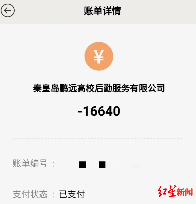 根据丹丹提供的截图,红星新闻看到,收费单位显示的是“秦皇岛鹏远高校后勤服务有限公司”。