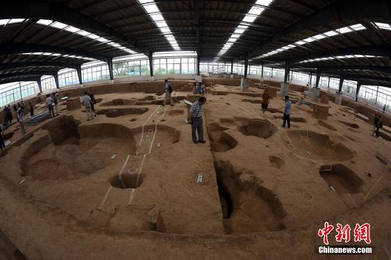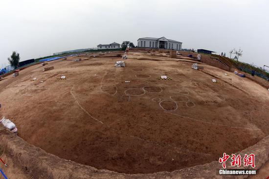 8月27日,河南巩义双槐树遗址上规模宏大的考古发掘遗存现场。该遗址于2005年文物调查时发现,2013年以来开展“寻找中国丝绸之源——郑州地区仰韶时代中晚期考古学文化面貌与文明起源问题研究”考古发掘项目,遗址年代主体为仰韶时代中晚期和龙山时代早期,已有重要发现包括仰韶时期大型环壕3条、大型夯土院落基址和活动广场1处、公共墓地3处、大型房址分布区2处、窑址24处、夯土祭坛3个、祭祀坑15处等。