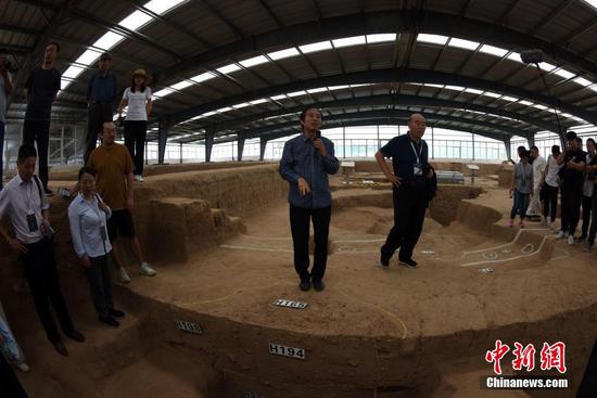 8月27日,河南巩义双槐树遗址上规模宏大的考古发掘遗存现场,郑州市文物考古研究院院长顾万发(手持话筒者)讲解该遗址最新发掘研究进展。该遗址于2005年文物调查时发现,2013年以来开展“寻找中国丝绸之源——郑州地区仰韶时代中晚期考古学文化面貌与文明起源问题研究”考古发掘项目,遗址年代主体为仰韶时代中晚期和龙山时代早期,已有重要发现包括仰韶时期大型环壕3条、大型夯土院落基址和活动广场1处、公共墓地3处、大型房址分布区2处、窑址24处、夯土祭坛3个、祭祀坑15处等。中新社记者 孙自法 摄