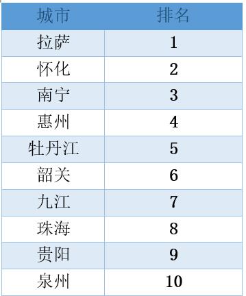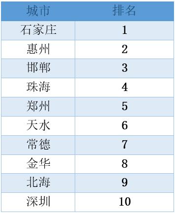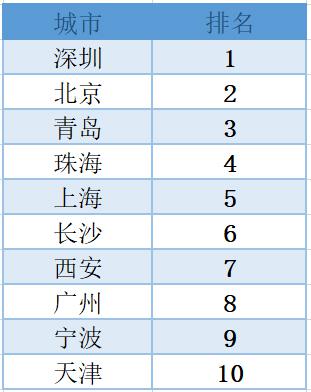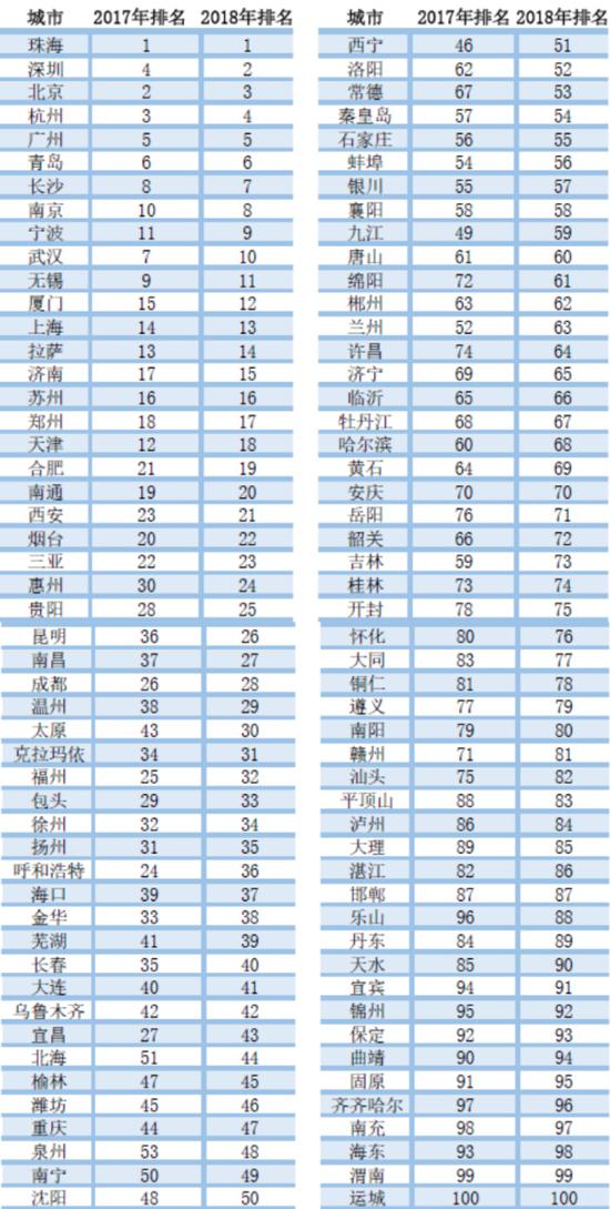 《排名》显示,除了珠海保持首位以外,深圳排名较去年有了两位的上升,北京从第二位下降到了第三。宁波从第11位进入了前十,排名第九,而无锡则跌出了前十。昆明、南昌、太原、洛阳、常德、绵阳和许昌排名变化显著,皆上升了十位及以上;而呼和浩特、宜昌、兰州、吉林排名皆下降了十位及以上。