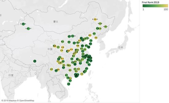 2018年中国城市可持续发展综合排名情况(1-100名颜色从绿至黄)