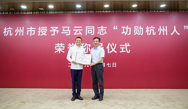 2019年9月7日,马云被授予“功勋杭州人”荣誉称号。杭州网的报道称,马云同志作为杭州人的杰出代表、杭州众多优秀企业家的先进典型,多年来致力于创新创业和公益事业,积极推动杭州经济社会发展和城市国际化,充分展现了杭州人敢为人先、坚韧不拔、立己达人、大气开放的风采。