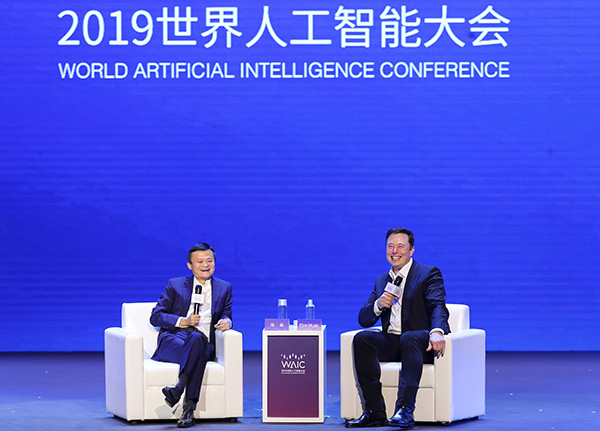 2019年8月29日,在世界人工智能大会上,马云对话美国“钢铁侠”马斯克。 新华社记者 丁汀 摄