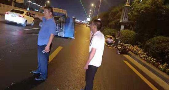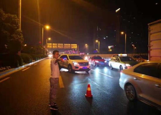 11日,记者联系到网友张先生。其称,事发10日晚凌晨零点左右,中州大道郑汴立交北下桥口向北约200米快车道,一辆白色轿车与一辆农用车发生事故,占用了3个车道,导致拥堵。其他车辆只得绕行缓慢通过,但见两位小伙将车停在事故车辆前方约50米处,快速跑下车指挥交通。