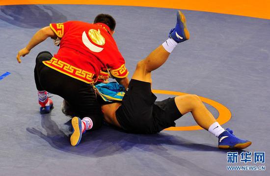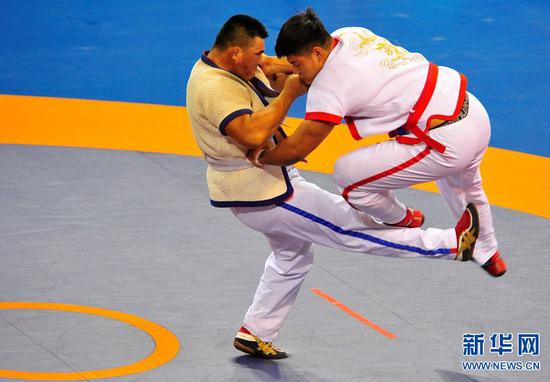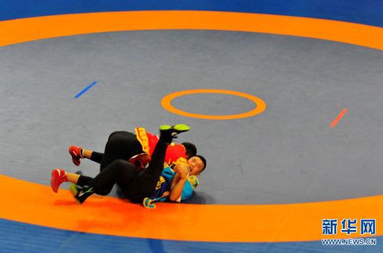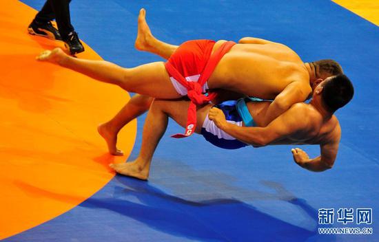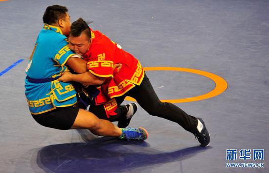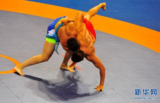 9月11日,第十一届全国少数民族传统体育运动会民族式摔跤项目在郑州大学中心体育馆进行,场内队员争夺激烈气氛热烈,向观众展示技艺与力量之美。新华网发(刘书亭 摄)