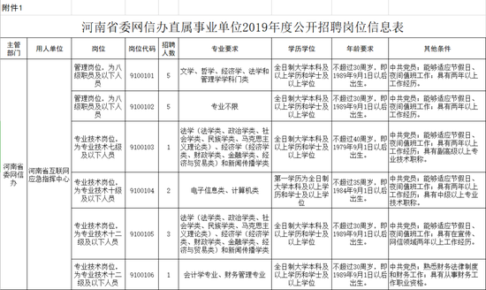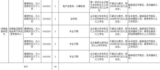 本次拟面向社会公开招聘工作人员26名,具体岗位、专业及人数等详见《河南省委网信办直属事业单位2019年度公开招聘岗位信息表》(附件1)。