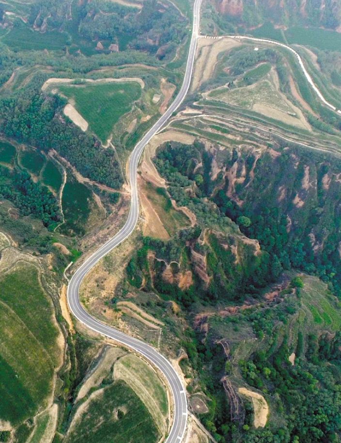 ↑7月18日,无人机拍摄的山西省临汾市浮山县新建投入使用的农村旅游+扶贫公路。高新生 摄