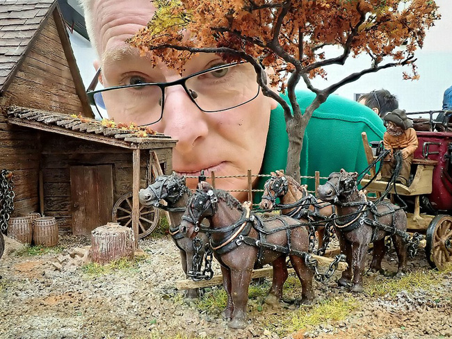 戴夫·格林(Dave Green)的作品展示了狂野西部的一幕,四匹马拉着一辆火柴盒大小的公共马车,每匹马都不到2.5厘米。