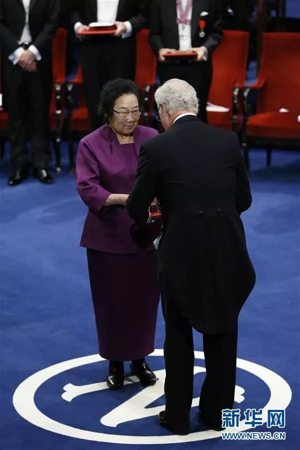 在瑞典首都斯德哥尔摩音乐厅举行的2015年诺贝尔奖颁奖仪式上,中国科学家屠呦呦(左)从瑞典国王卡尔十六世·古斯塔夫手中领取诺贝尔生理学或医学奖(2015年12月10日摄)。