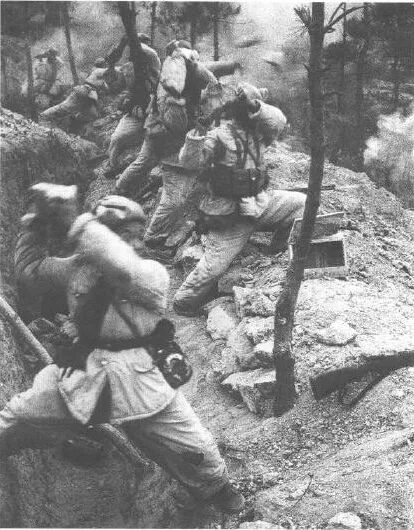 1951年2月,在抗美援朝战争 “中元山阻击战”中,面对敌机的轮番轰炸,英勇的战士们一齐开火,给予敌人沉重打击;在敌人猛烈的炮火攻击下,战士们顽强抵抗,连续击退敌人的进攻。
