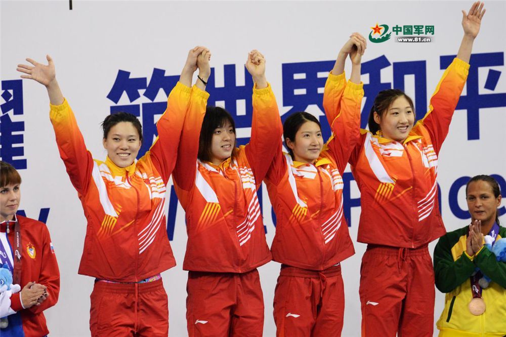 女子4x50米障碍接力游泳比赛中,中国队获得金牌。王传顺摄影