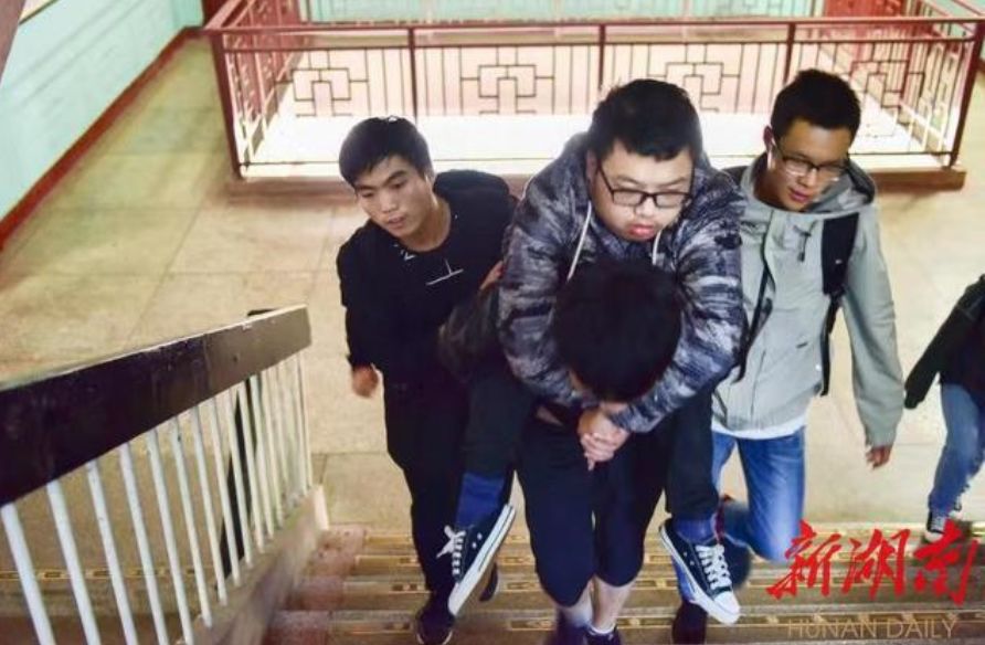 不过同学们说:“大家都是同学,更是兄弟,大学四年我们都愿意背着你上课。”