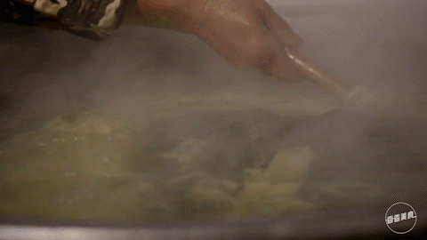 和普通胡辣汤洗过之后直接下锅的做法不同,白胡辣汤里的面筋是甩出来的。洗好的面筋抻成薄片儿,师傅会趁热放进水里,拿木棒不停地搅拌。整个过程要持续个把小时,手不能停,否则面筋就出不来絮状的效果,影响口感。