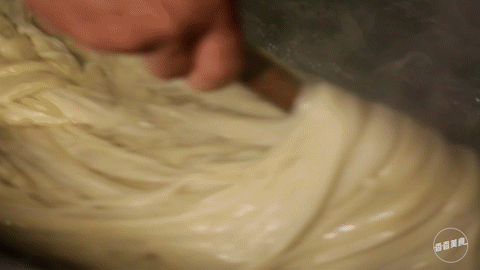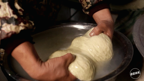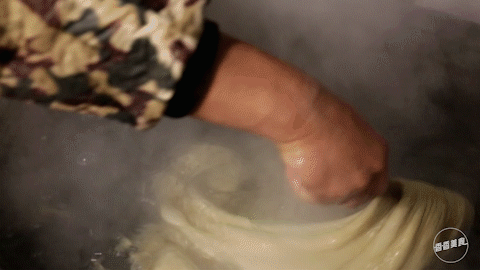 甩面筋的过程看似没有技术含量,只是一味地搅动木棒。但若想把这三五斤重的面疙瘩甩成穗儿穗儿,手上的力量,水温和火候的把控都是缺一不可的。没有个几年的功夫,是练不出来的。