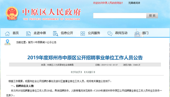 2019年11月22日,在郑州市中原区人民政府网(http://www.zhongyuan.gov.cn)发布招聘信息,发布时间为7个工作日。