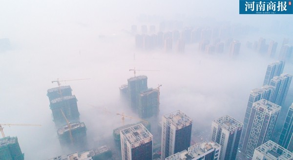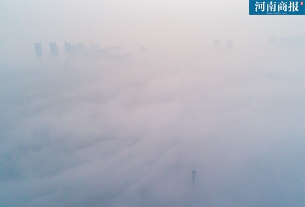 2019年12月8日早上,郑州出现平流雾景观,整个城市都笼罩云雾之中,仅有高层建筑露出顶部,若隐若现,美轮美奂,宛如空中之城。